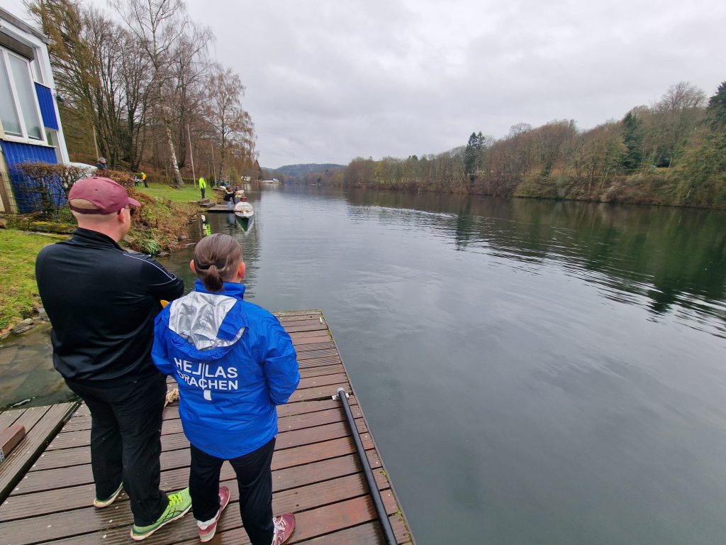 Am 28.03., dem Tag des Rennens, legt der Wetterbericht warme und regenfeste Kleidung nahe. Um 8 Uhr morgens starten wir dann zusammen nach Nordrheinwestfalen. Einigen von uns schlägt das Navi die deutlich kürzere Strecke über Land vor, sie finden sich auf landschaftlich reizvollen Straßen wieder. Zum Glück hatten wir das Rennen ohne eigenes Boot gemeldet.