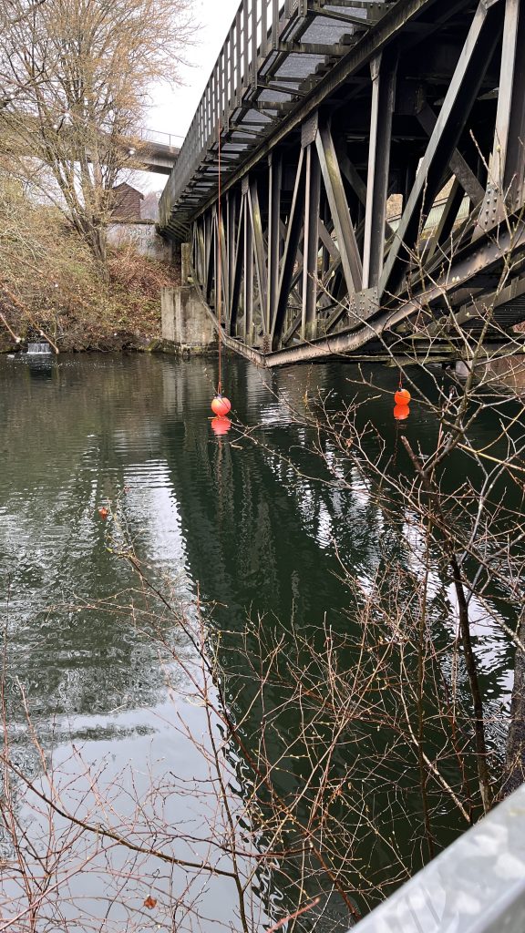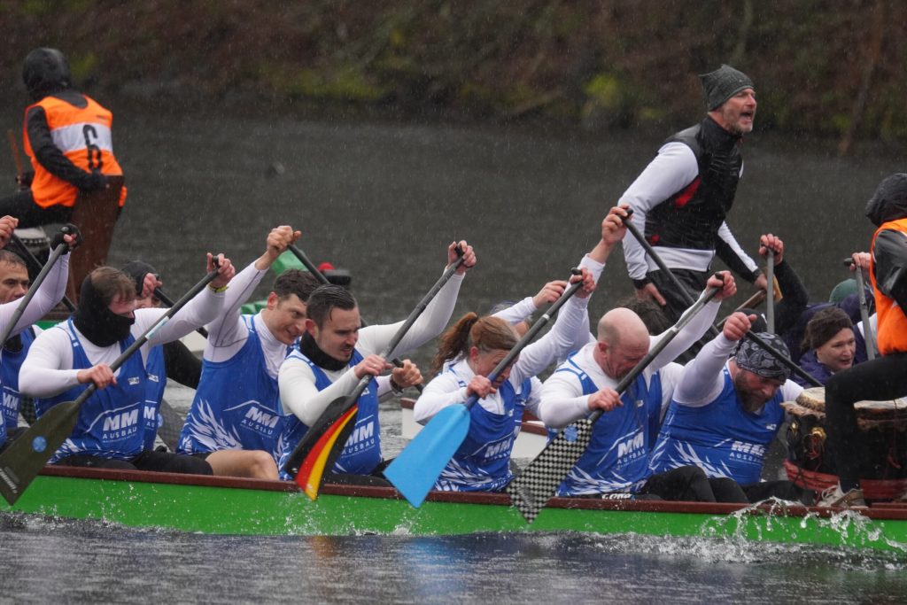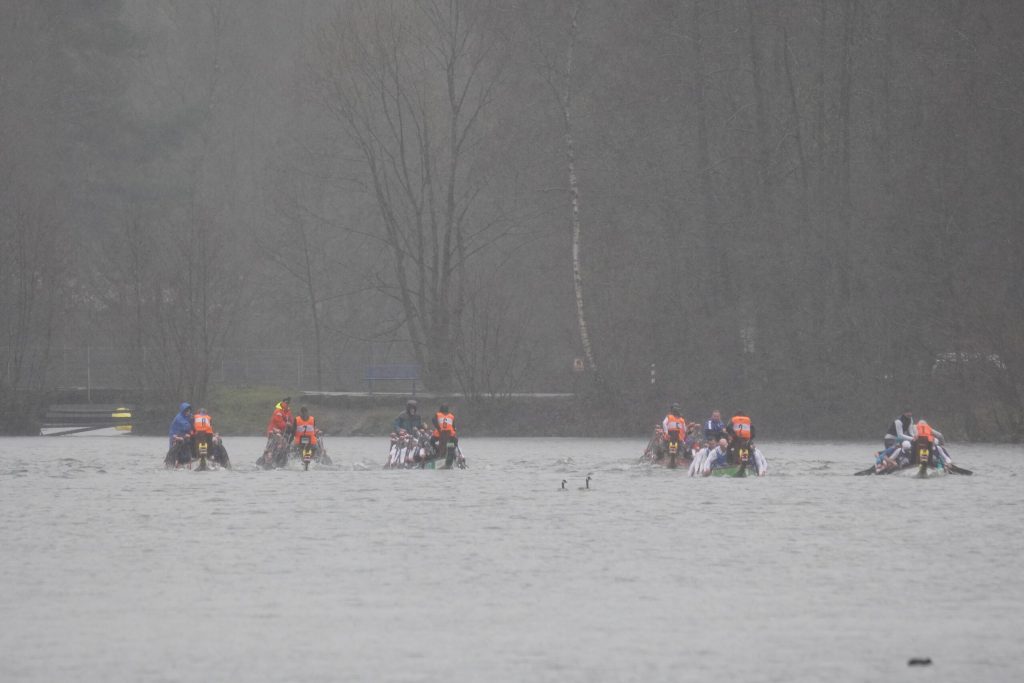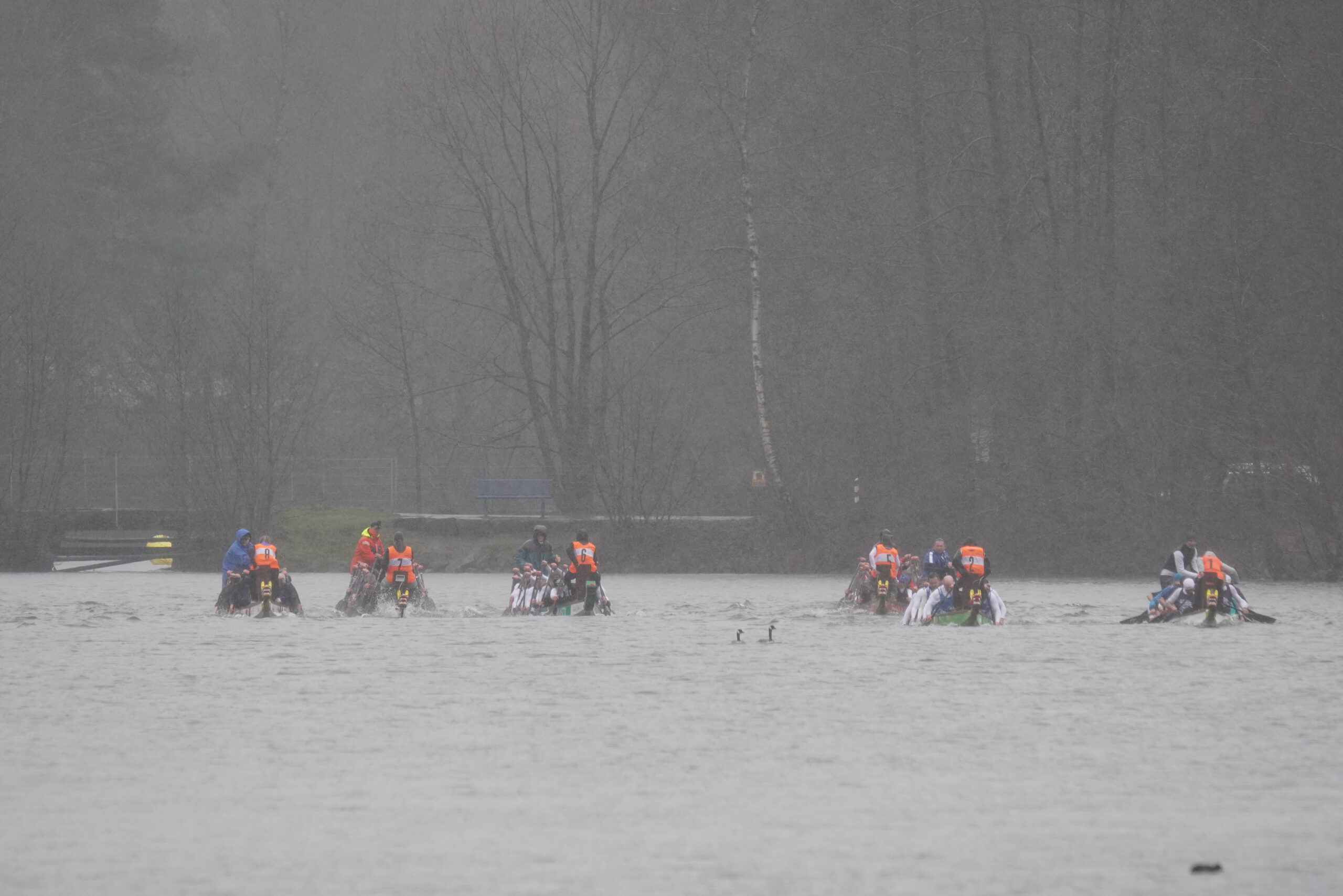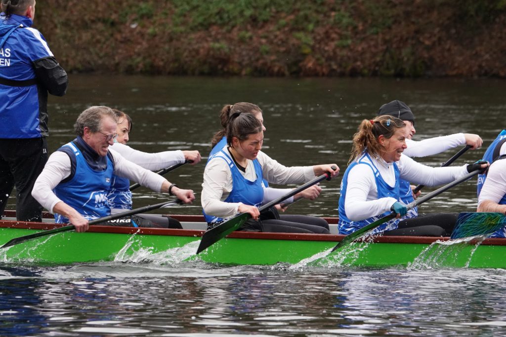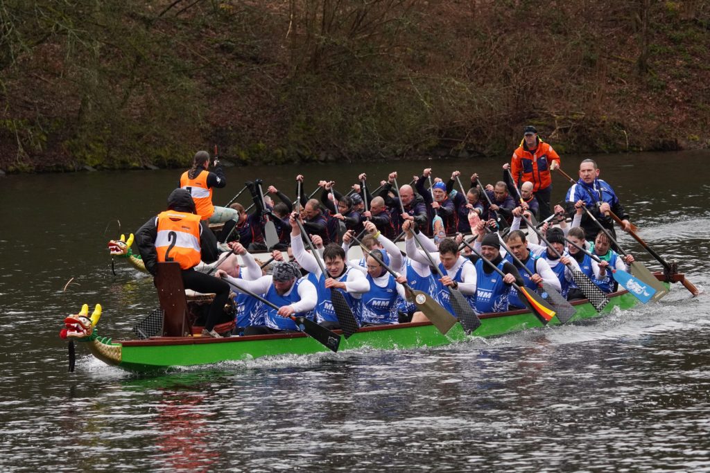 12:55 Uhr: Start zum Großen Preis von Beyenburg – Ab jetzt heißt es Druck und Länge. Wir starten gut und halten mit den anderen mit. Die erste Wende naht. Wer noch nie in Beyenburg war: Das heißt, dass wir unter zwei Brücken durchfahren, von denen die erste so niedrig ist, dass sich unsere Trommlerin und der Steuermann ducken müssen, um im Boot zu bleiben. Die erste Wende läuft gut, zurück unter den beiden Brücken durch, wieder zurück auf die Strecke. Wir merken recht schnell, dass die anderen Teams stark sind, wir halten aber dagegen. Der Graupel wechselt wieder in Regen. Wieder geht es unter einer Brücke durch, die aber hoch genug für Trommlerin und Steuermann ist – die zweite Wende folgt und wieder zurück auf die Strecke. Erste Runde ist durch. Wir liegen auf Platz 6 von 8, weiter „Druck“ und „Länge“ Rufe von unserem Steuermann. Wieder die niedrige Brücke, wieder der Ruf an die Trommlerin „Ducken!“. Die nächste Wende und weiter. Der Regen lässt nach. Wieder auf die lange Strecke und von hinten hören wir immer wieder ein Boot, das versucht zu überholen. Aber nicht mit uns. Wende Nummer 4 und zurück auf die Strecke. Die zweite Runde ist durch und wir behaupten Platz 6.