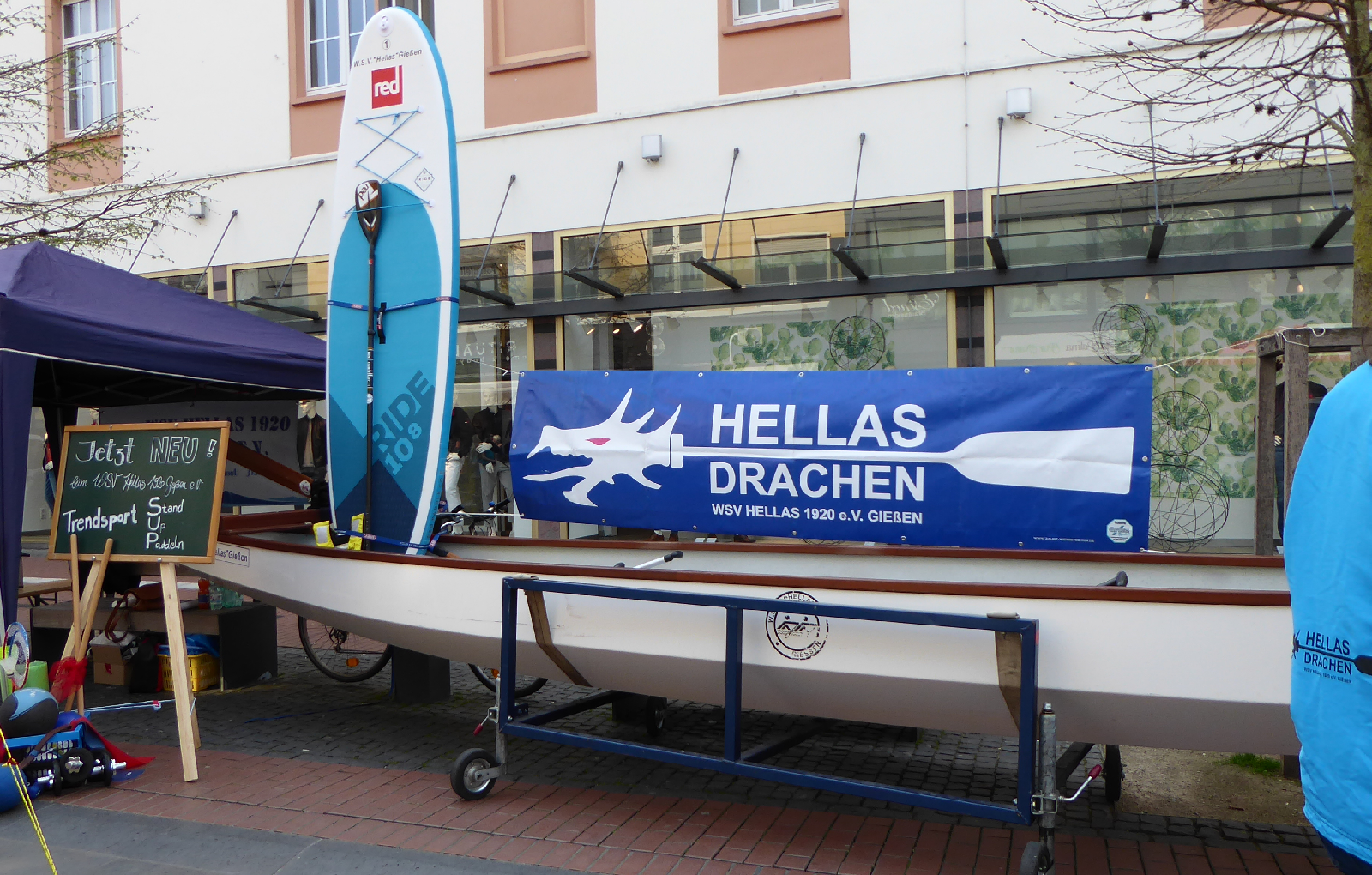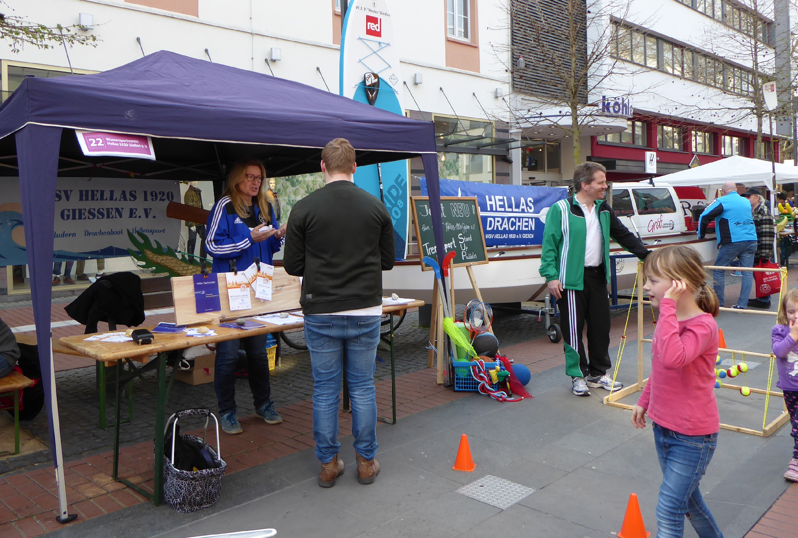 Wie jedes Jahr war der Wassersportverein Hellas auch am vergangenen Sonntag wieder beim „Sport in der City“ in der Gießener Fußgängerzone mit dabei – und dieses Jahr auch mit dem kompletten Sportangebot, d.h. mit Rudern, Drachenboot, Hallensport und erstmalig auch mit dem neuen SUP-Angebot (Stand Up Paddling).