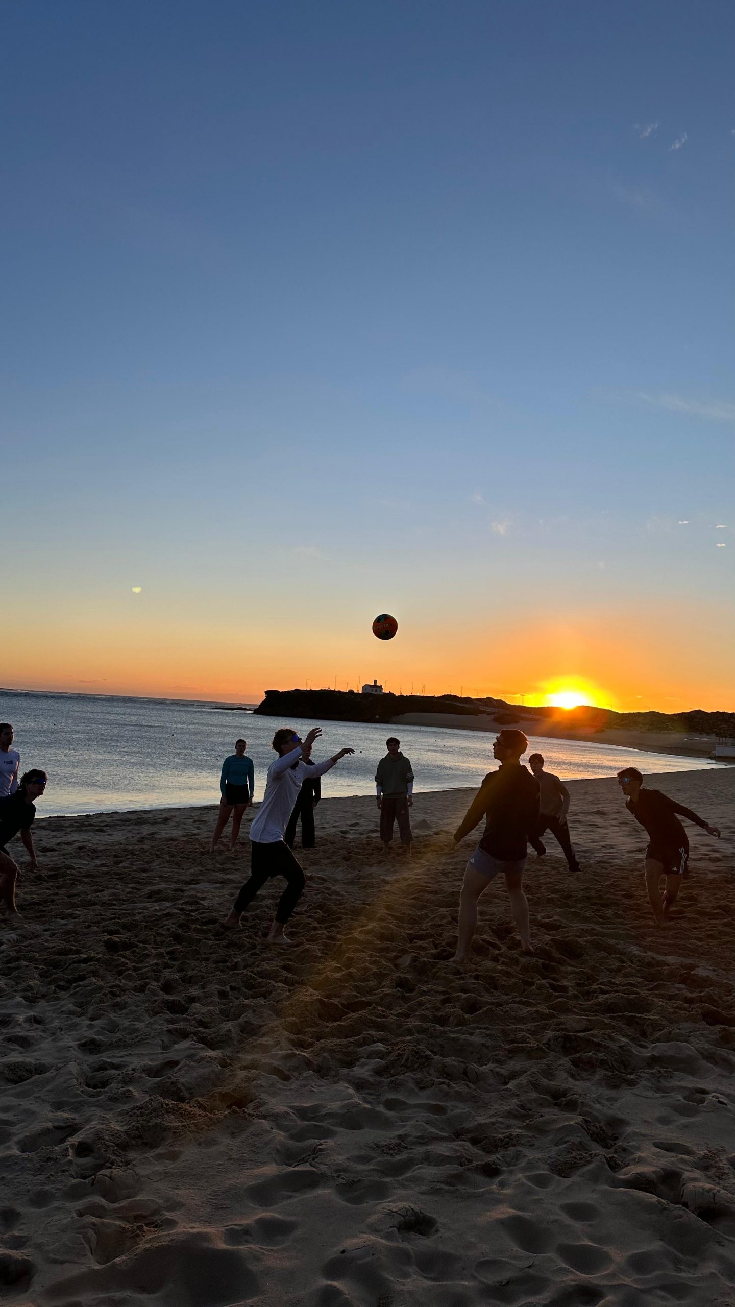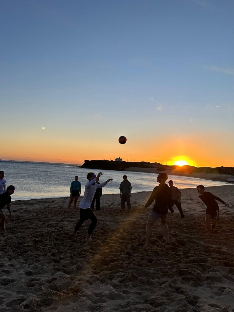 Schon nach den ersten Tagen hatte das Trainingslager seinen eigenen Rhythmus. Morgens Wassertraining, dann Lauf- oder Athletikeinheiten, danach wieder eine Wassereinheit. Dazwischen Regeneration, Technikbesprechung und natürlich die kleinen Momente, die keiner in den Trainingsplan schreibt. Wenn die Sonne dann langsam Richtung Atlantik sank, begann der Teil des Tages, den niemand zählen musste. Beachvolleyball am Abend, direkt im warmen Licht des Sonnenuntergangs nicht als Pflichtprogramm, sondern weil es sich einfach richtig anfühlte. Barfuß im Sand, mit Musik aus einem Handylautsprecher, mal ehrgeizig, mal komplett chaotisch, aber immer mit einem Lächeln. Wer zusah, merkte schnell: Das war nicht „Training Nummer vier“, das war Teambuilding.